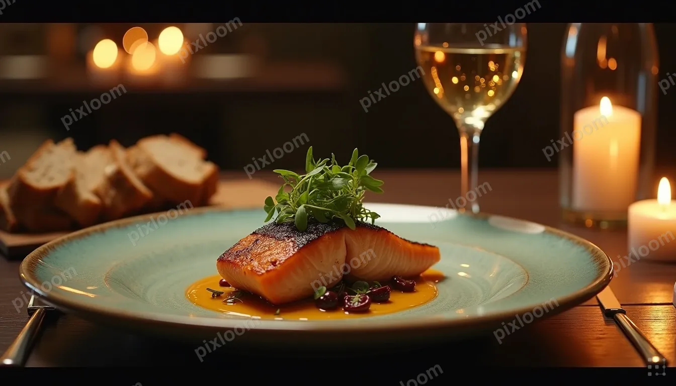 Cinematic1344x768A beautifully plated dinner at an upscale restaurant — grilled salmon with microgreens, a glass of white wine, rustic bread on a wooden board, candlelight reflections on dark tabletop. Rich warm tones, shallow depth of field. Wide cinematic composition with clean negative space. No text, no watermark, no logos, no UI elements.