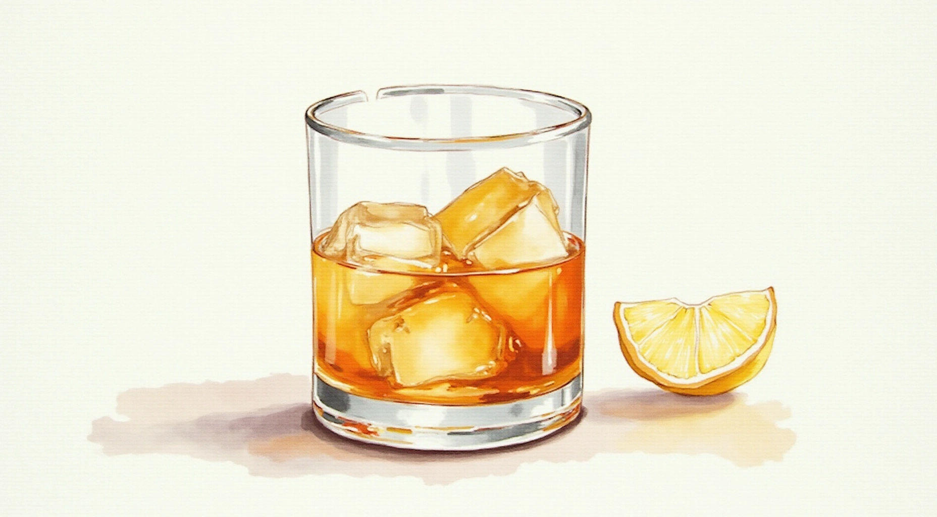 Watercolor1856x1024A clear, amber-gold Old Fashioned served over a large ice cube, smooth and spirit-forward with a gentle sweetness and warming spice from bitters. Bright citrus oils from an orange twist and lemon twist lift the aroma, rich, and elegant.