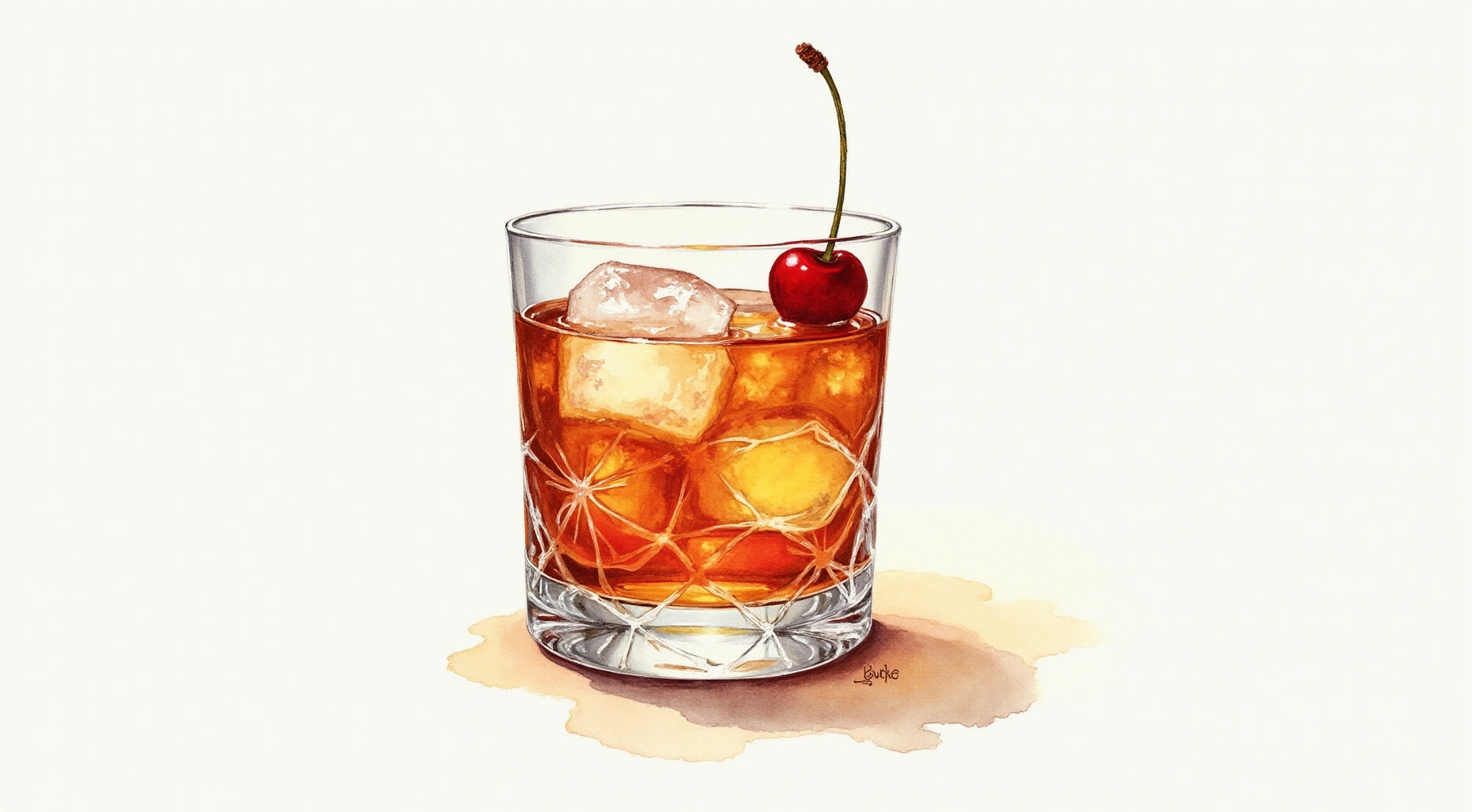 Watercolor1856x1024A deep amber Manhattan served ice-cold, smooth and spirit-forward with a balanced blend of sweet and dry vermouth. Aromatic bitters add warm spice and complexity, finishing rich, crisp, and refined. Garnished with a cherry.