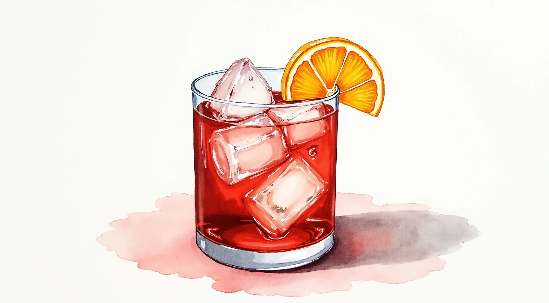 Watercolor1856x1024A deep ruby Negroni served over a large ice cube, bold and bitters with herbal depth and a smooth, warming finish. Bright citrus from an orange wheel garnish lifts the aroma and ties it together.