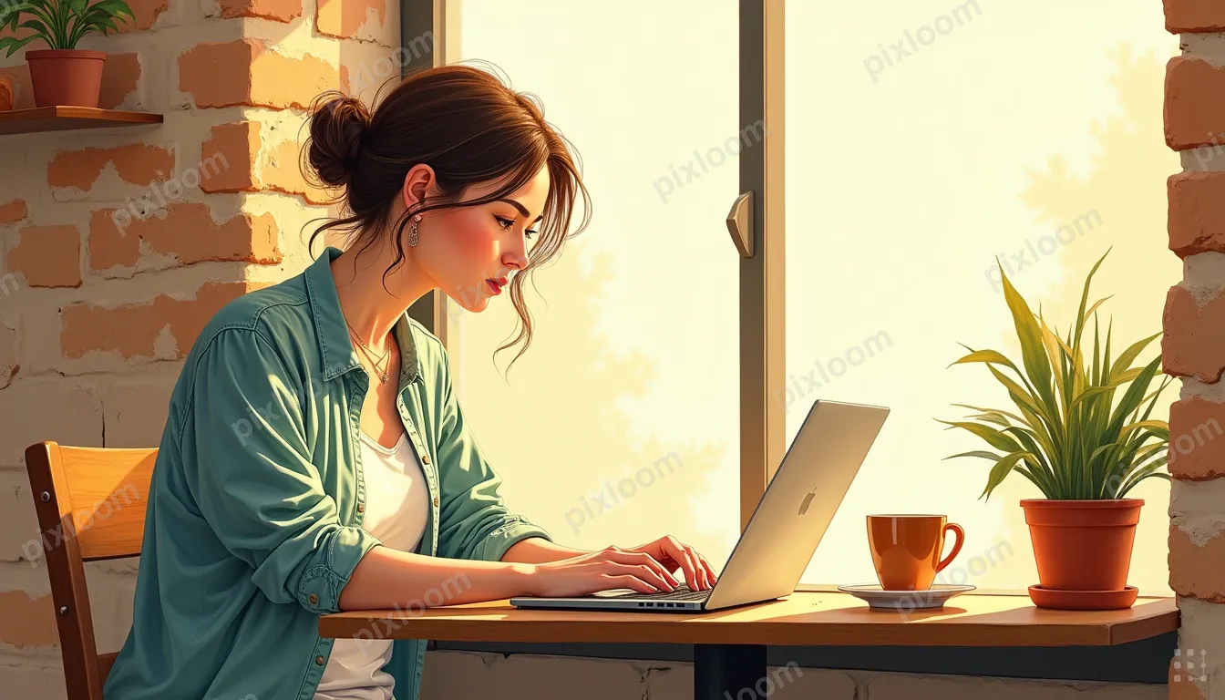 Fashion Sketch1344x768A freelancer at a sunlit coffee shop window seat, laptop open, focused on work. A ceramic latte cup sits beside them, its glaze warm and glossy. Exposed brick wall in the background, warm afternoon light flooding in. Plants on the windowsill. Wide cinematic composition with clean negative space. No text, no watermark, no logos, no UI elements.