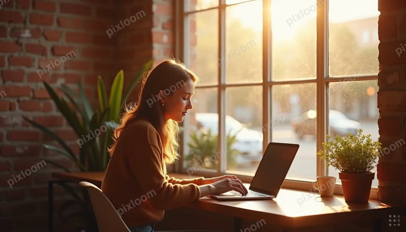 Photorealistic1344x768A freelancer working on a laptop at a sunlit coffee shop window seat, a ceramic latte cup beside them, exposed brick wall, warm afternoon light, plants on the windowsill, focused creative energy. Wide cinematic composition with clean negative space. No text, no watermark, no logos, no UI elements.