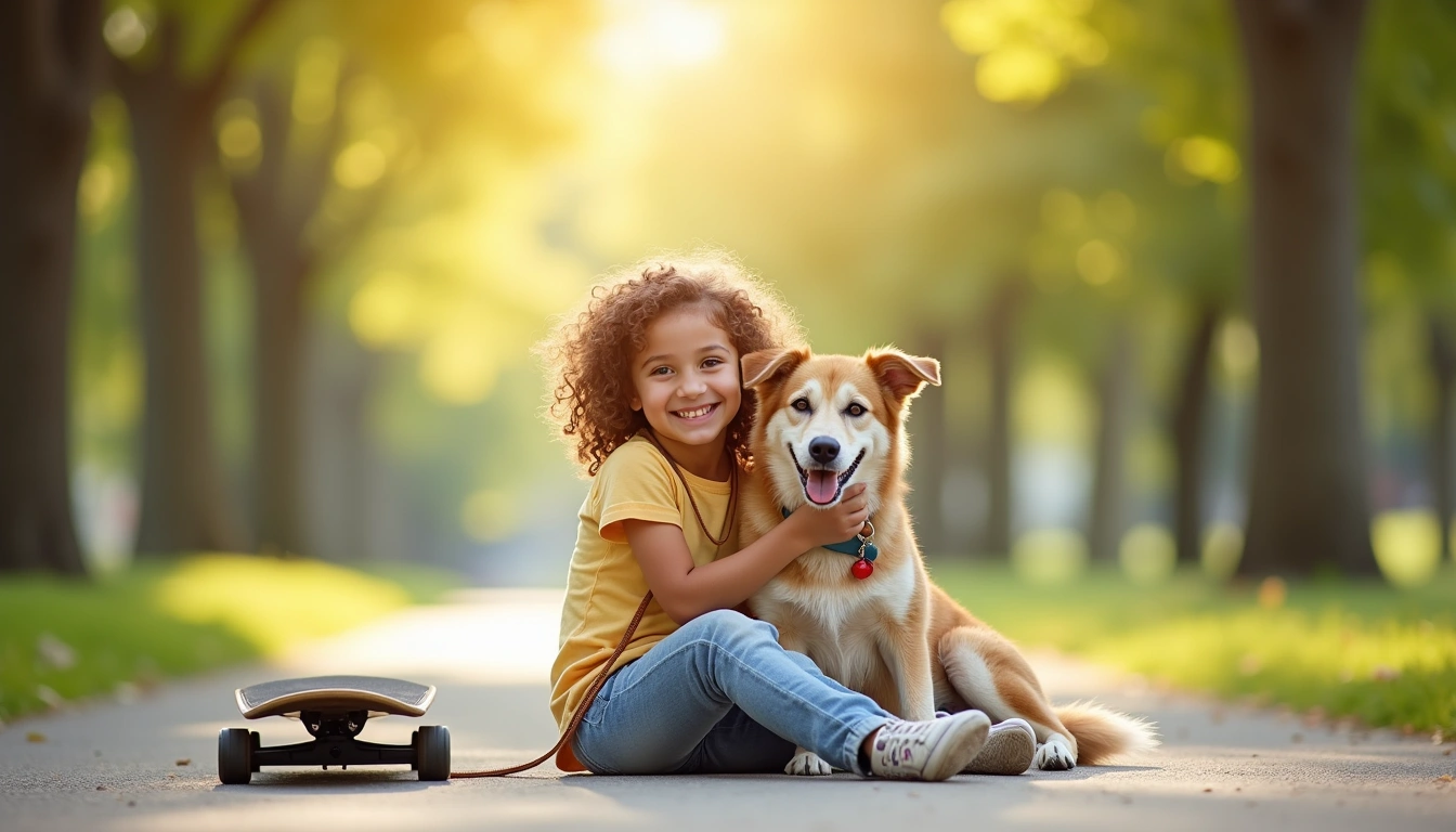Bright & Airy1344x768A girl with curly hair sits on a paved path, hugging a medium-sized dog on a leash. A skateboard lies on the ground beside them. They smile at the camera in a sunlit park with trees in the background.