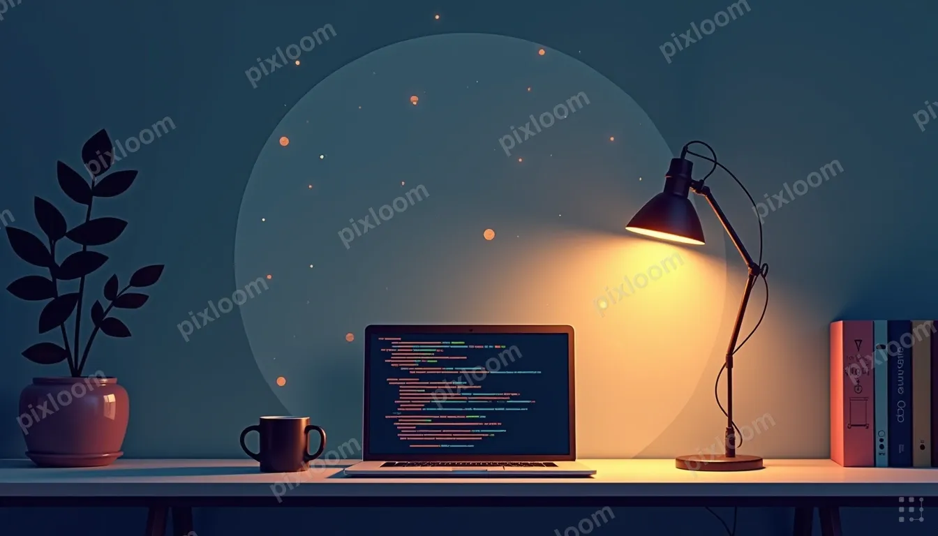 Modern Illustration1344x768A laptop on a minimal desk at night. The screen glows with abstract lines suggesting code in a dark editor. A desk lamp casts warm light from the left. A coffee mug nearby. No text, no people, no hands.