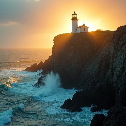 Cinematic1024x1024a lighthouse on a rocky cliff at golden hour