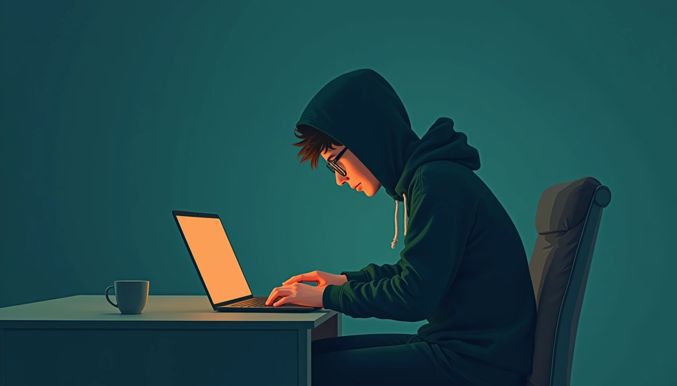 Retro Editorial1344x768A lone figure in a dark hoodie hunched over a glowing laptop late at night, dim room, multiple screens visible, exhausted posture but still typing. No text.