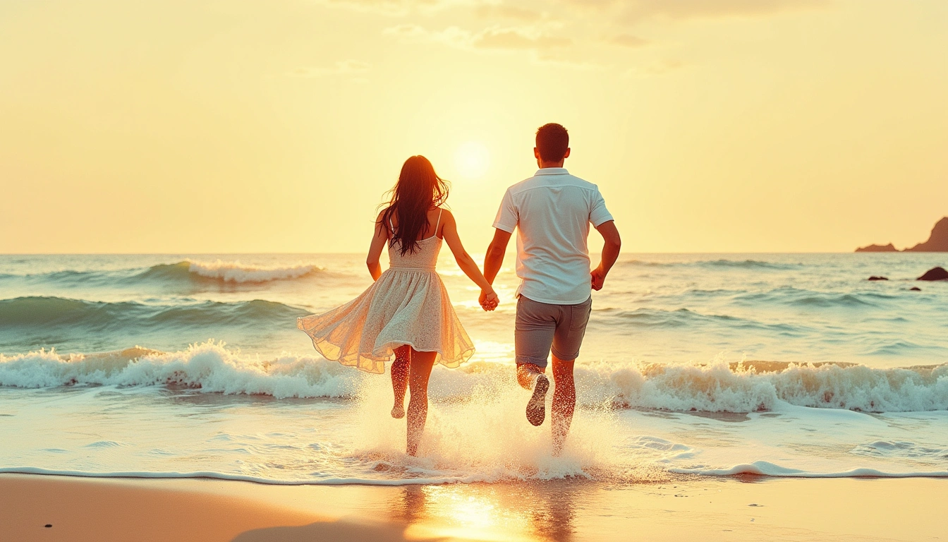 Fashion Sketch1344x768A man and a woman run hand-in-hand along a wet beach at sunset away from camera. Water sprays around their feet as they dash through shallow waves. The sun sits low on the horizon behind them, creating lens flare and circular light orbs across the scene.