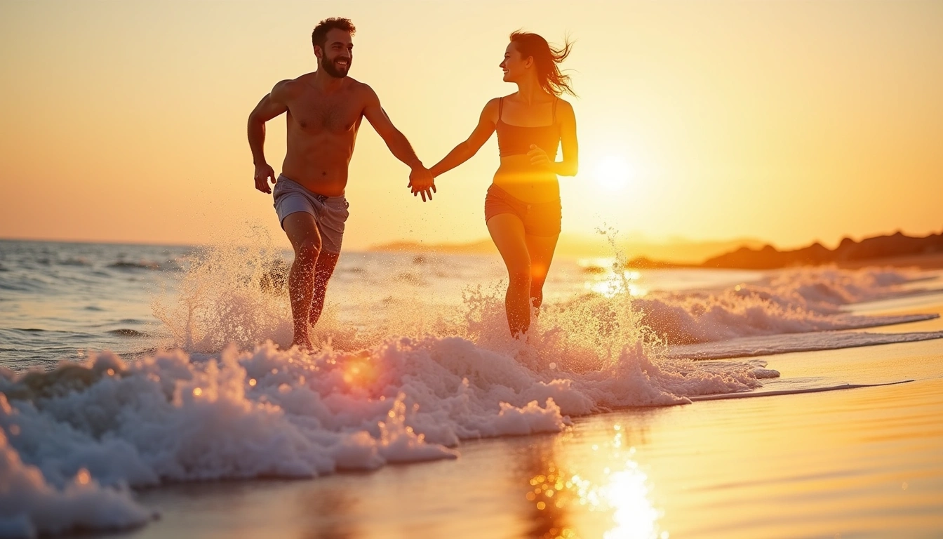 Bright & Airy1344x768A man and a woman run hand-in-hand along a wet beach at sunset. Water sprays around their feet as they dash through shallow waves. The sun sits low on the horizon behind them, creating lens flare and circular light orbs across the scene.