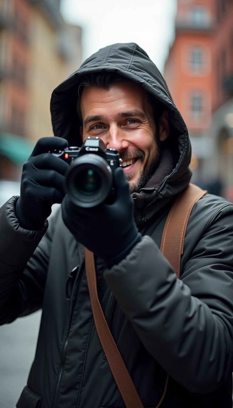 Editorial Portrait768x1344A man in a heavy hooded jacket and gloves holds a camera to his eye, taking a photo. He smiles as he looks through the viewfinder. A camera strap runs over his shoulder. Urban buildings blur in the background.