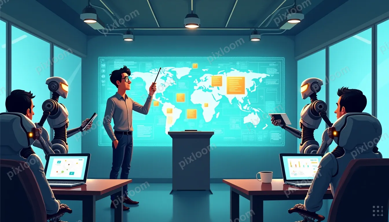 Vector1344x768A man with glasses and dark hair stands at a lectern, raising a wand-like pointer. He faces a semicircle of robots in a high-tech command room. Each robot holds or interacts with screens, tablets, and floating panels showing code and diagrams. A laptop sits on a desk to the left, and a large touch-screen board with sticky-note-style blocks is in front. Holographic data and networks surround the scene.