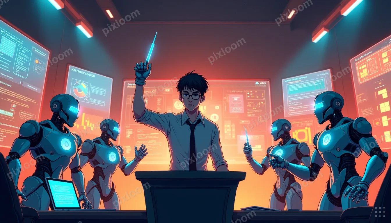 Comic (Big Kids)1344x768A man with glasses and dark hair stands at a lectern, raising a wand-like pointer. He faces a semicircle of robots in a high-tech command room. Each robot holds or interacts with screens, tablets, and floating panels showing code and diagrams. A laptop sits on a desk to the left, and a large touch-screen board with sticky-note-style blocks is in front. Holographic data and networks surround the scene.