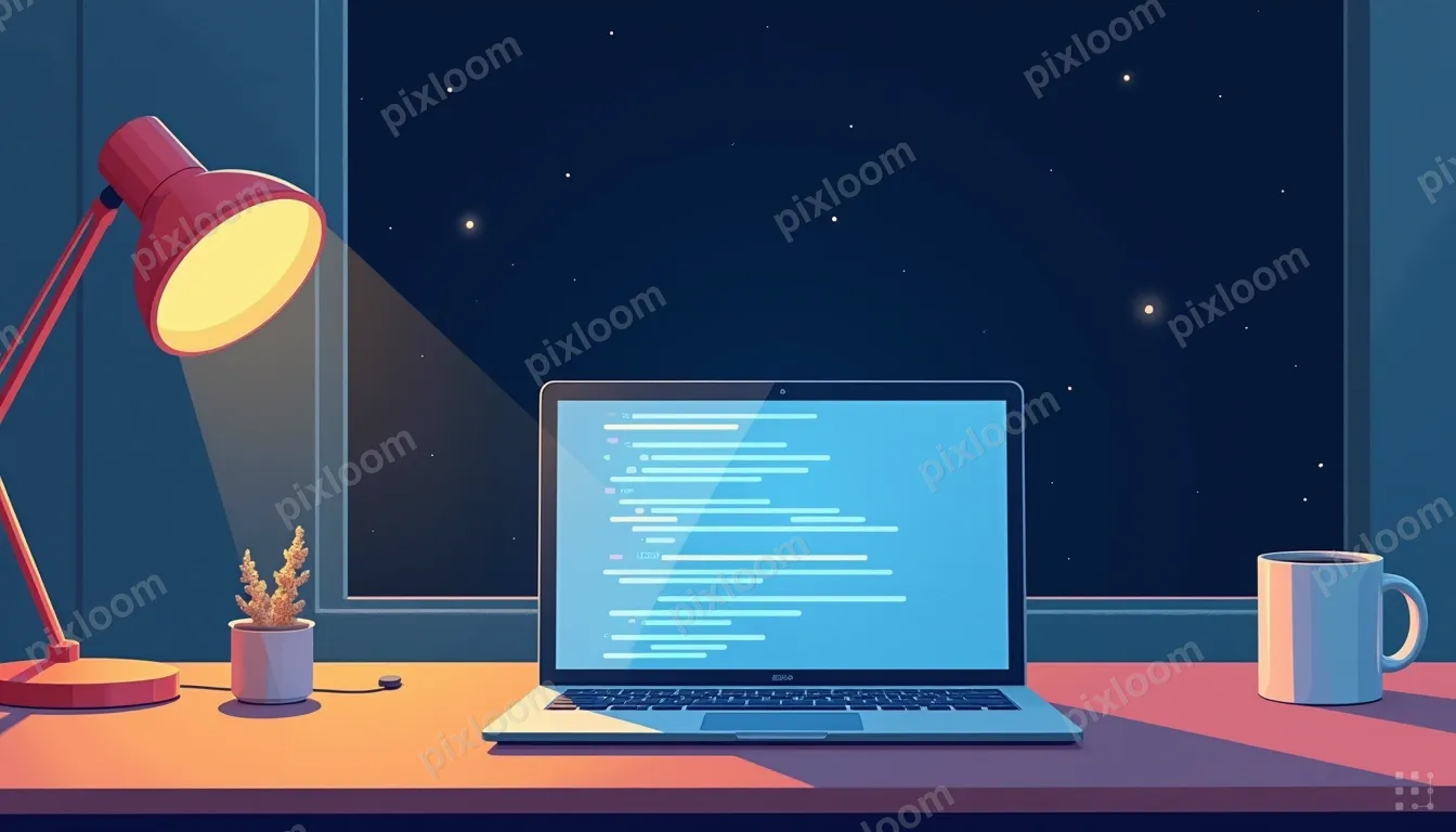 Modern Illustration1344x768A modern flat illustration of a laptop on a minimal desk at night. The screen glows with abstract lines suggesting code in a dark editor theme. A simple desk lamp casts warm light from the left. A coffee mug sits nearby. Muted tones with warm amber accents from the lamp and cool blue from the screen. Clean shapes, subtle gradients, no outlines. The mood is quiet focus and determination. No text, no people, no hands.