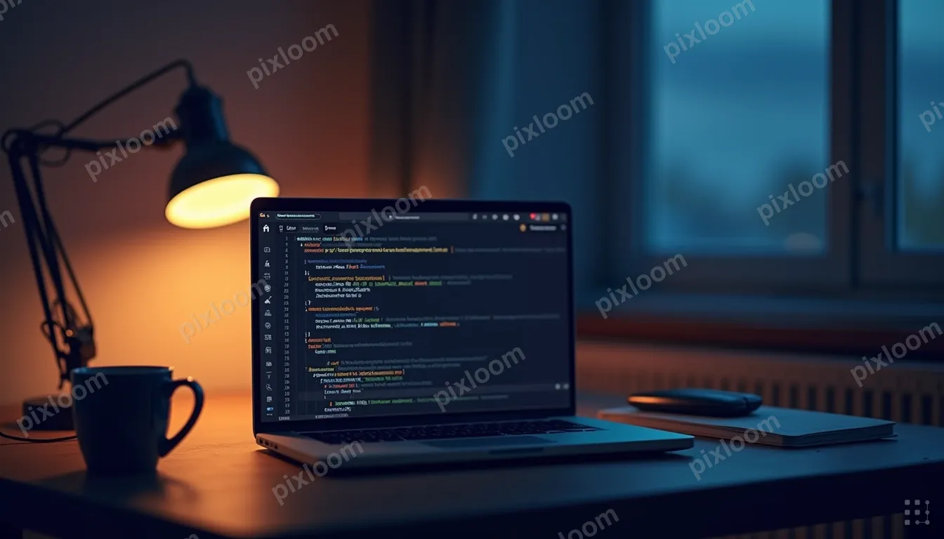 Modern Illustration1344x768A moody, warm-toned photograph of a laptop on a dark wooden desk at night. The screen shows blurred lines of code in a dark editor theme. A single warm desk lamp illuminates the scene from the left. A coffee mug sits nearby. The laptop keyboard is partially visible. Shallow depth of field with the code on screen softly out of focus. The mood is quiet determination, someone choosing to be here late, not forced to be. No text, no people, no hands.