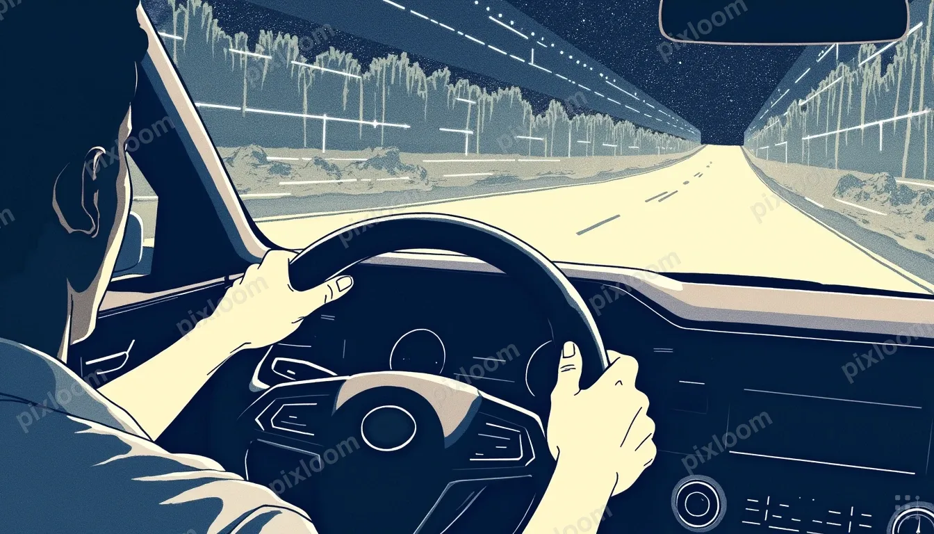 Woodblock Print1344x768A person's hands gripping a steering wheel. Through the windshield, a road ahead with glowing AI circuit patterns or data streams flowing along it. The driver is in control, the road ahead is futuristic and fast. Text overlay: "The human still drives."