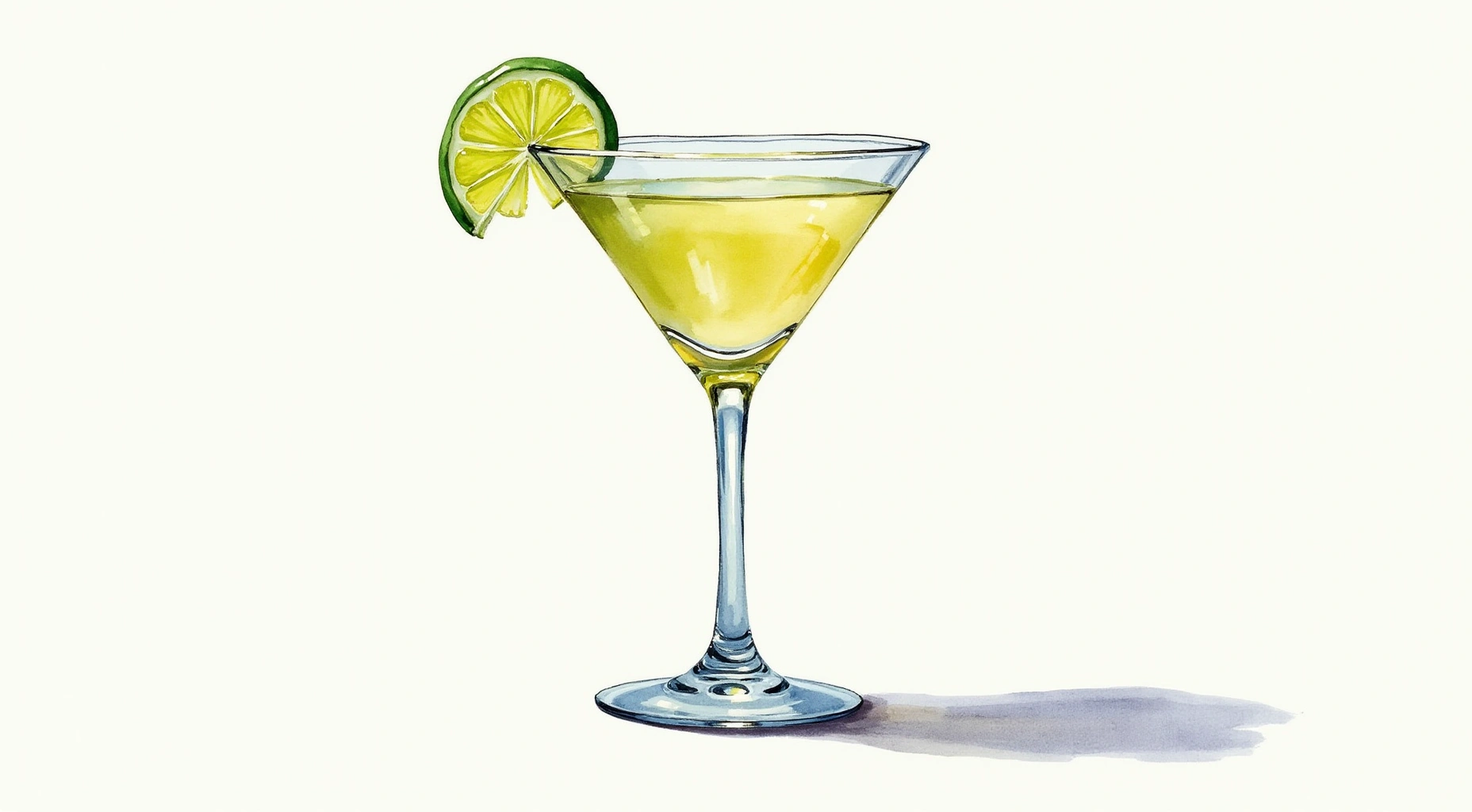 Watercolor1856x1024A refreshing Daiquiri featuring 2 ounces of smooth rum, either white or dark. It includes 0.75 ounces of freshly squeezed lime juice, balanced with 0.75 ounces of sweet simple syrup. Garnished with a vibrant lime wedge for an inviting touch. The drink presents a clear, light color with a glossy sheen, embodying a perfect balance of tangy and sweet flavors.