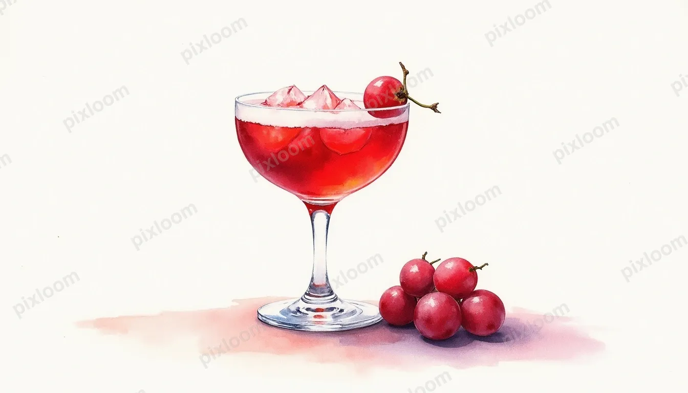 Watercolor1344x768A very bright, ruby-red Enzoni served ice cold in a chilled coupe, with a lightly frothy top and a crisp, bittersweet citrus aroma. Subtle grape notes soften the Campari bitter, finishing tart, juicy, and refreshing. Garnished with a single grape.