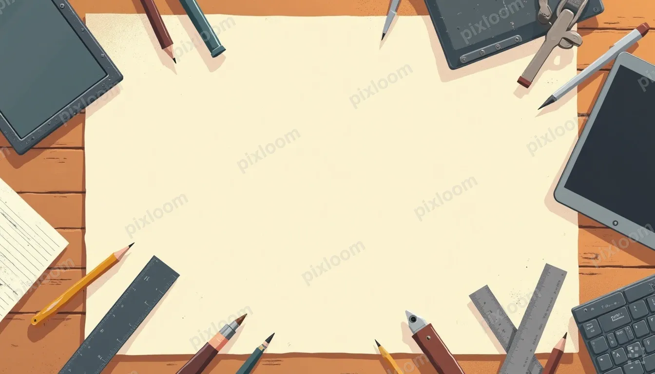 Modern Illustration1344x768A workbench seen from above. Traditional tools (pencil, ruler, compass) on one side, modern tools (keyboard, stylus, screen) on the other. Both show signs of use. No text, no people.