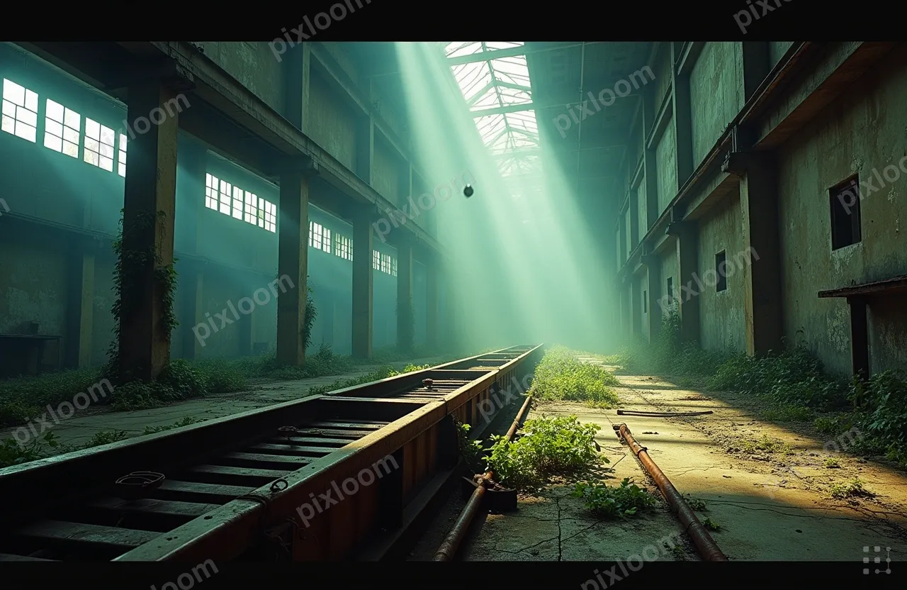 Cinematic1280x832Abandoned factory hall with broken windows, light beams, nature creeping in, industrial decay