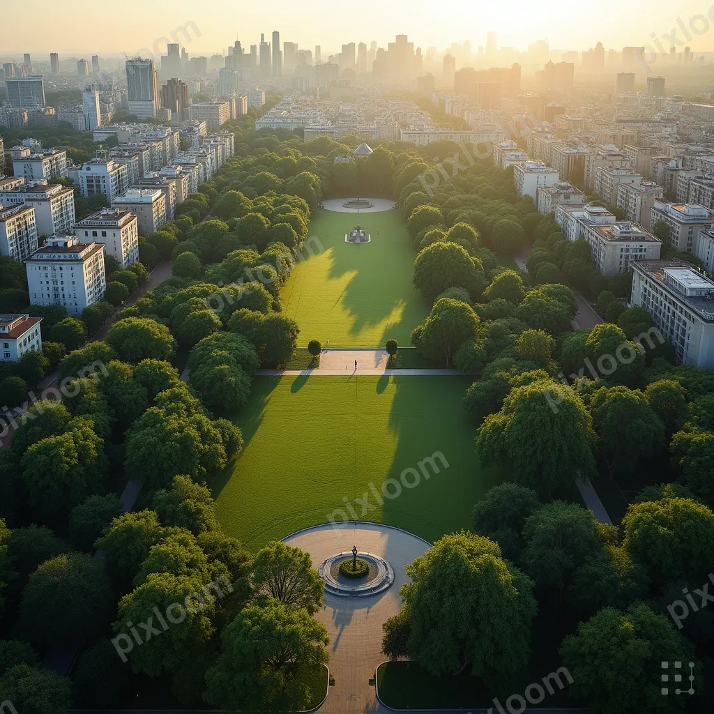 Photorealistic1024x1024Aerial view of a city park surrounded by buildings, green oasis in concrete, bird's eye