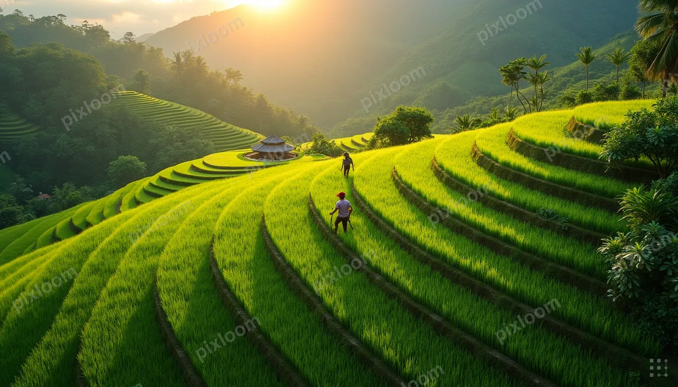 Photorealistic1344x768Aerial view of rice terraces in Bali, bright green stepped paddies, farmers, tropical forest