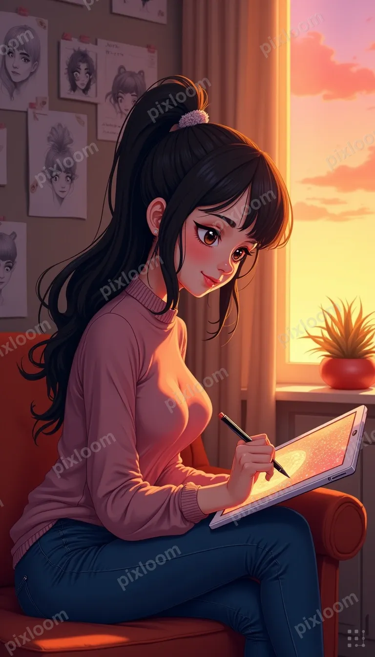 Animebigkids768x1344Anime-style artist drawing on a tablet, inspiration sketches pinned on wall, cozy room, evening