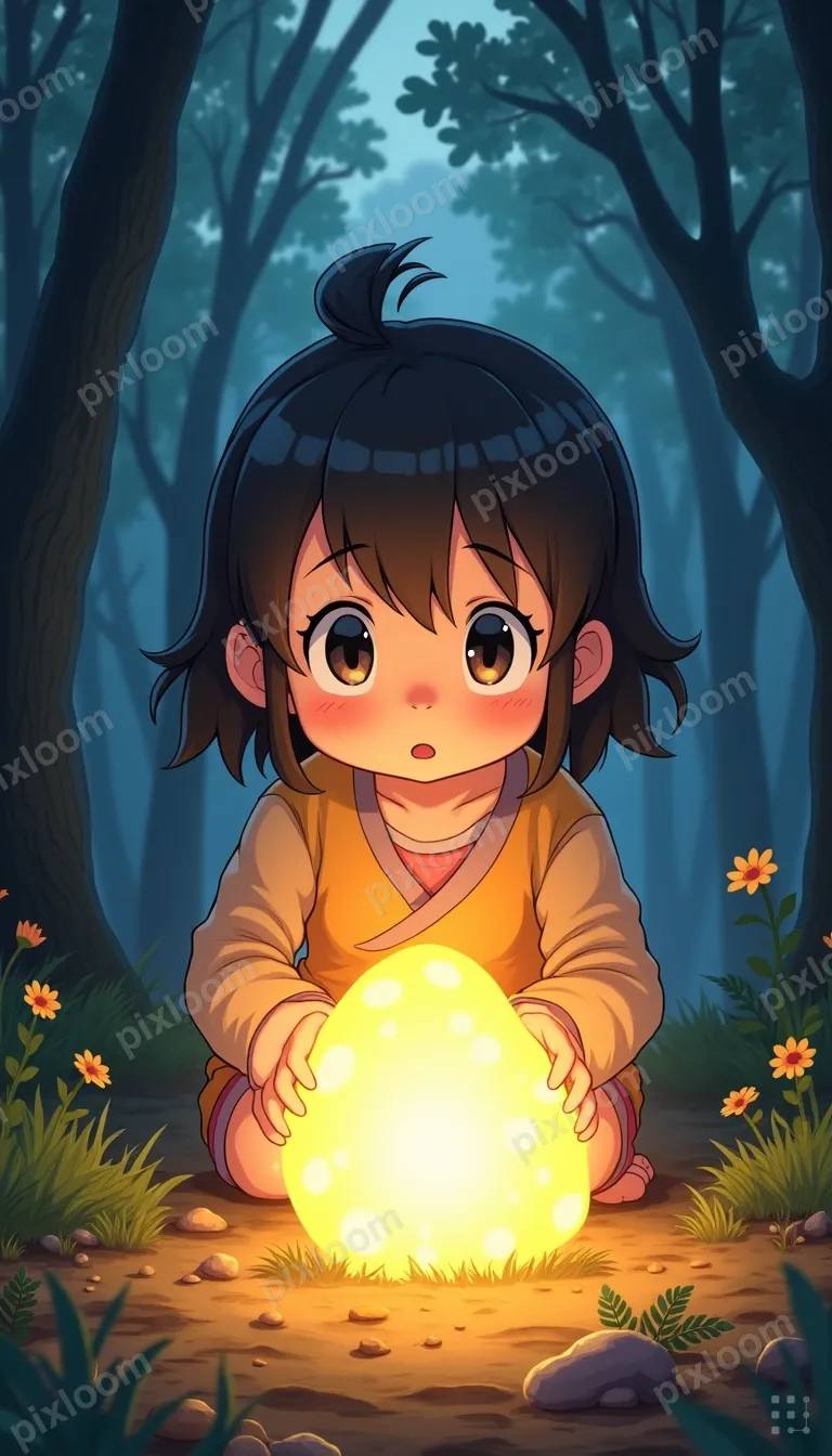 Animekids768x1344Anime-style child finding a magical glowing stone in a forest, wonder on their face