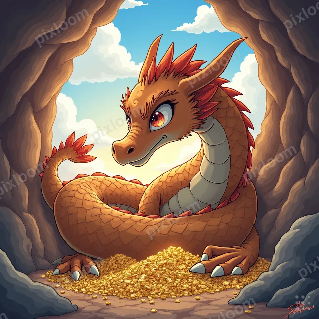 Anime1024x1024Anime-style dragon curled around a treasure hoard, scales glinting, one eye open, cave setting