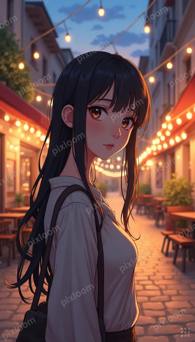 Anime768x1344Anime-style European cafe street, cobblestones, string lights, evening atmosphere, warm glow