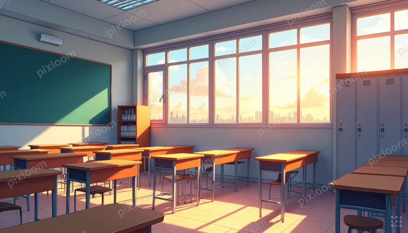 Animebigkids1344x768Anime-style high school classroom with sunlight streaming through windows, empty desks, nostalgic