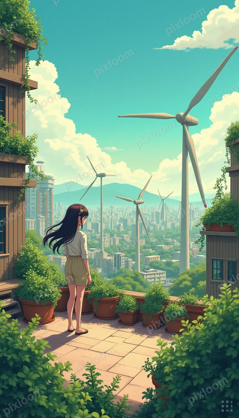 Animebigkids768x1344Anime-style rooftop garden in a futuristic eco-city, wind turbines, greenery on buildings