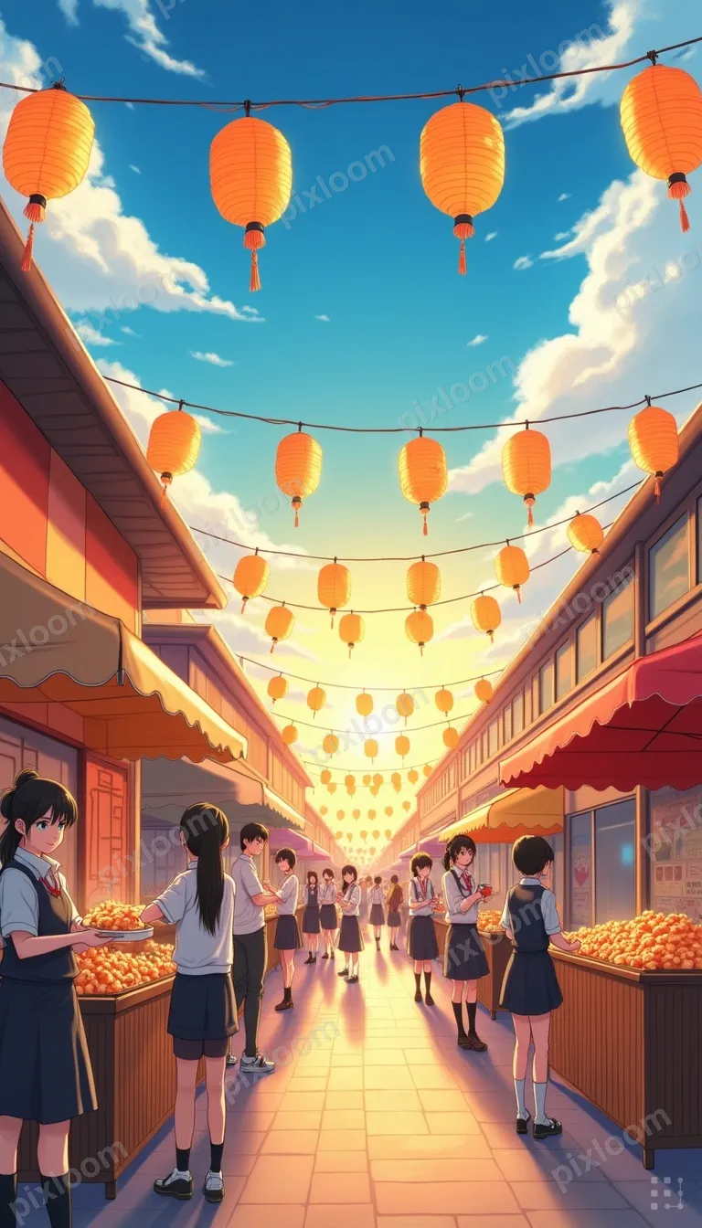 Animebigkids768x1344Anime-style school festival scene, students at stalls, takoyaki, goldfish scooping, lanterns