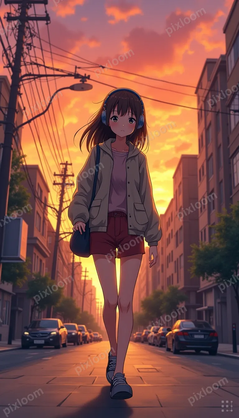 Animebigkids768x1344Anime-style teen walking home from school, sunset, headphones, city streets, contemplative