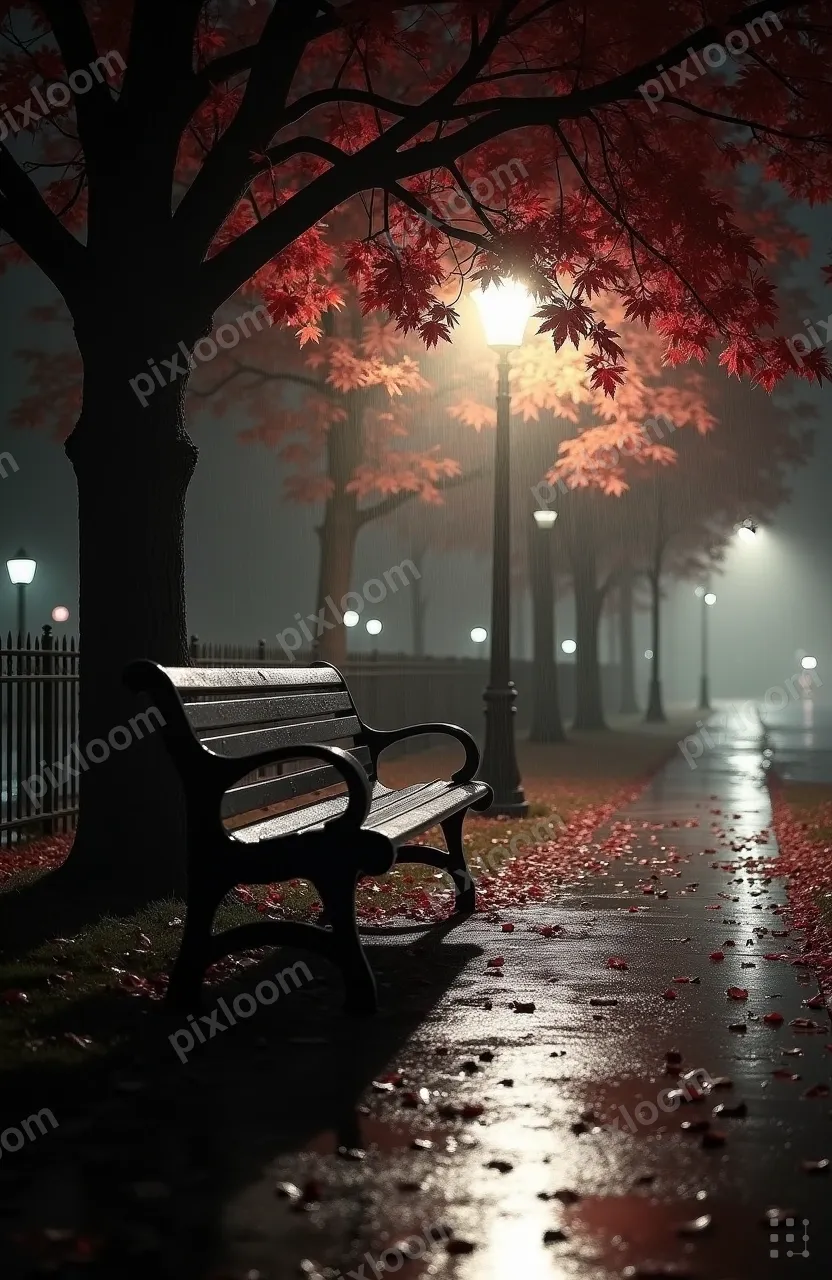 Film Noir832x1280Autumn rain on a park bench under a red maple tree, wet fallen leaves, golden streetlamp glow