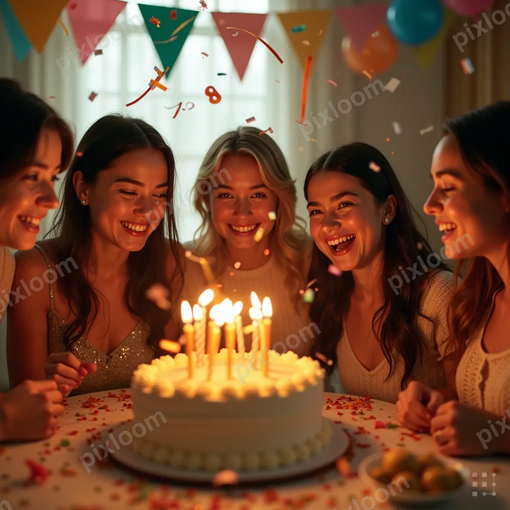 Photorealisticadults1024x1024Birthday party with friends blowing out candles on a cake, confetti in air, colorful decorations