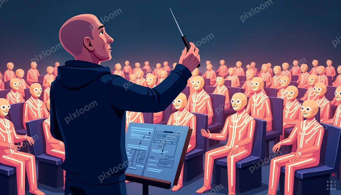 Cartoon1344x768Camera positioned behind and slightly to the right of the conductor, at shoulder height. The conductor is seen from the back, roughly 3/4 view, taking up the left third of the frame. Only the back of the head, shoulders, and raised right arm holding the baton are visible. No face visible at all. The conductor wears a dark navy hoodie.The conductor's right arm is extended forward, baton raised. In front of the conductor, filling the remaining two thirds of the frame, rows of abstract glowing AI agents, geometric humanoid figures with circuit patterns, seated in curved rows. They emit streams of code and architecture diagrams. A music stand with a system architecture blueprint is visible at the bottom edge of the frame between the conductor and the orchestra. Wide composition. No text.