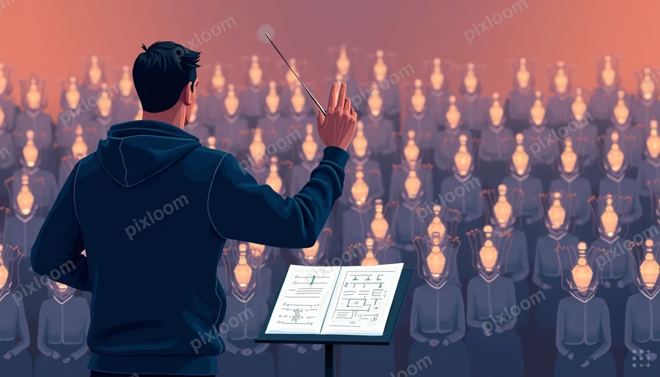 Vector1344x768Camera positioned behind and slightly to the right of the conductor, at shoulder height. The conductor is seen from the back, roughly 3/4 view, taking up the left third of the frame. Only the back of the head, shoulders, and raised right arm holding the baton are visible. No face visible at all. The conductor wears a dark navy hoodie with white drawstrings. The conductor's right arm is extended forward, baton raised. In front of the conductor, filling the remaining two thirds of the frame, rows of abstract glowing AI agents, geometric humanoid figures with circuit patterns, seated in curved rows. They emit streams of code and architecture diagrams. A music stand with a system architecture blueprint is visible at the bottom edge of the frame between the conductor and the orchestra. Muted violet and warm gray palette. Wide composition. No text.