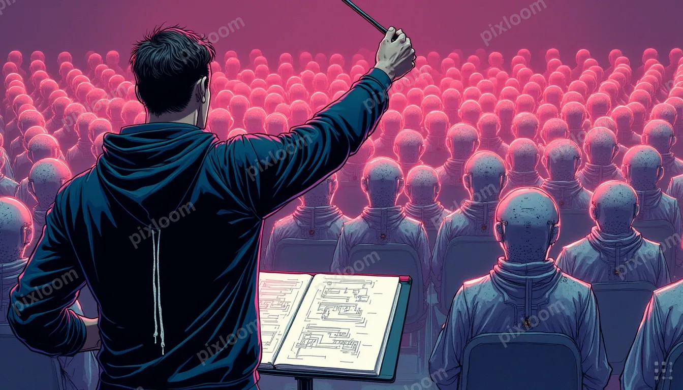 Pulp Comic1344x768Camera positioned behind and slightly to the right of the conductor, at shoulder height. The conductor is seen from the back, roughly 3/4 view, taking up the left third of the frame. Only the back of the head, shoulders, and raised right arm holding the baton are visible. No face visible at all. The conductor wears a dark navy hoodie with white drawstrings. The conductor's right arm is extended forward, baton raised. In front of the conductor, filling the remaining two thirds of the frame, rows of abstract glowing AI agents, geometric humanoid figures with circuit patterns, seated in curved rows. They emit streams of code and architecture diagrams. A music stand with a system architecture blueprint is visible at the bottom edge of the frame between the conductor and the orchestra. Muted violet and warm gray palette. Wide composition. No text.