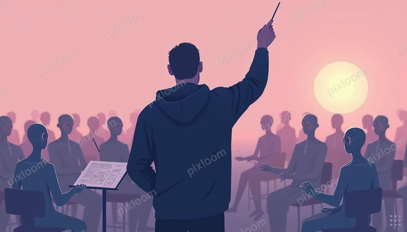 Minimalist1344x768Camera positioned behind and slightly to the right of the conductor, at shoulder height. The conductor is seen from the back, roughly 3/4 view, taking up the left third of the frame. Only the back of the head, shoulders, and raised right arm holding the baton are visible. No face visible at all. The conductor wears a dark navy hoodie.The conductor's right arm is extended forward, baton raised. In front of the conductor, filling the remaining two thirds of the frame, rows of abstract glowing AI agents, geometric humanoid figures with circuit patterns, seated in curved rows. They emit streams of code and architecture diagrams. A music stand with a system architecture blueprint is visible at the bottom edge of the frame between the conductor and the orchestra. Muted violet and warm gray palette. Wide composition. No text.