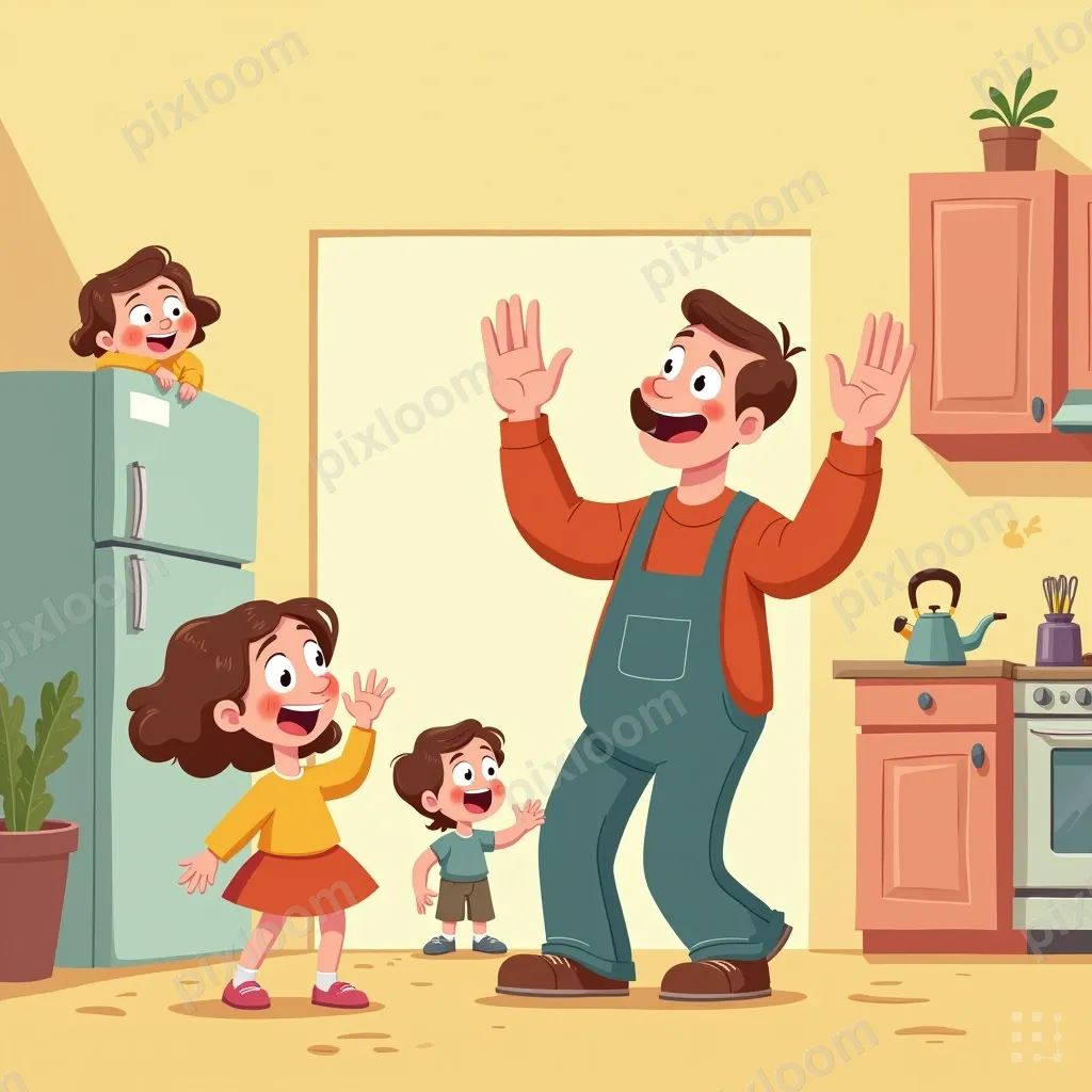 Cartoonkids1024x1024Cartoon dad doing funny dance moves while kids laugh hysterically, kitchen background, playful chaos