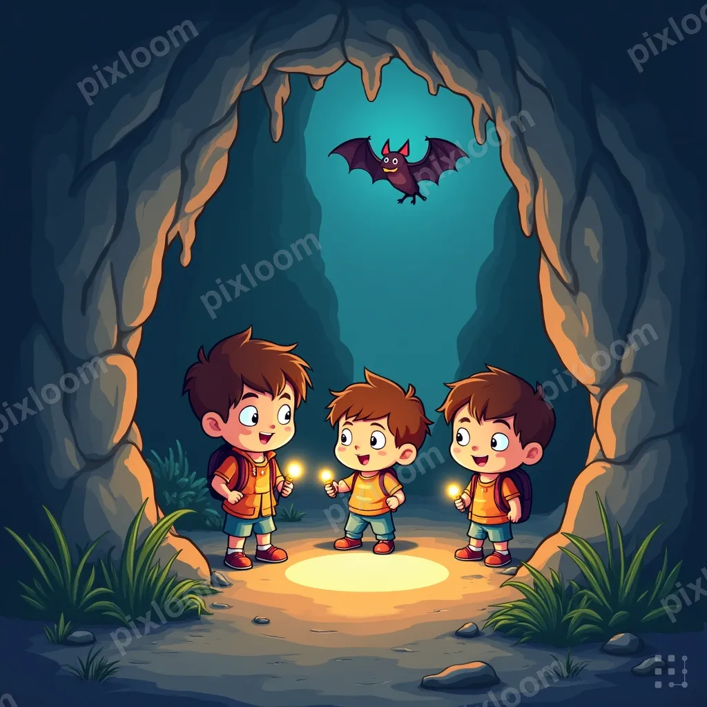 Cartoonkids1024x1024Cartoon kids exploring a cave with flashlights, stalactites, friendly bat, adventure quest