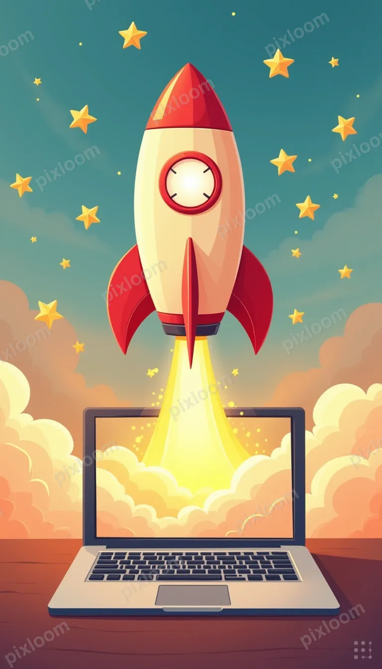 Cartoon768x1344Cartoon rocket launching from laptop screen, stars and clouds, startup and growth metaphor
