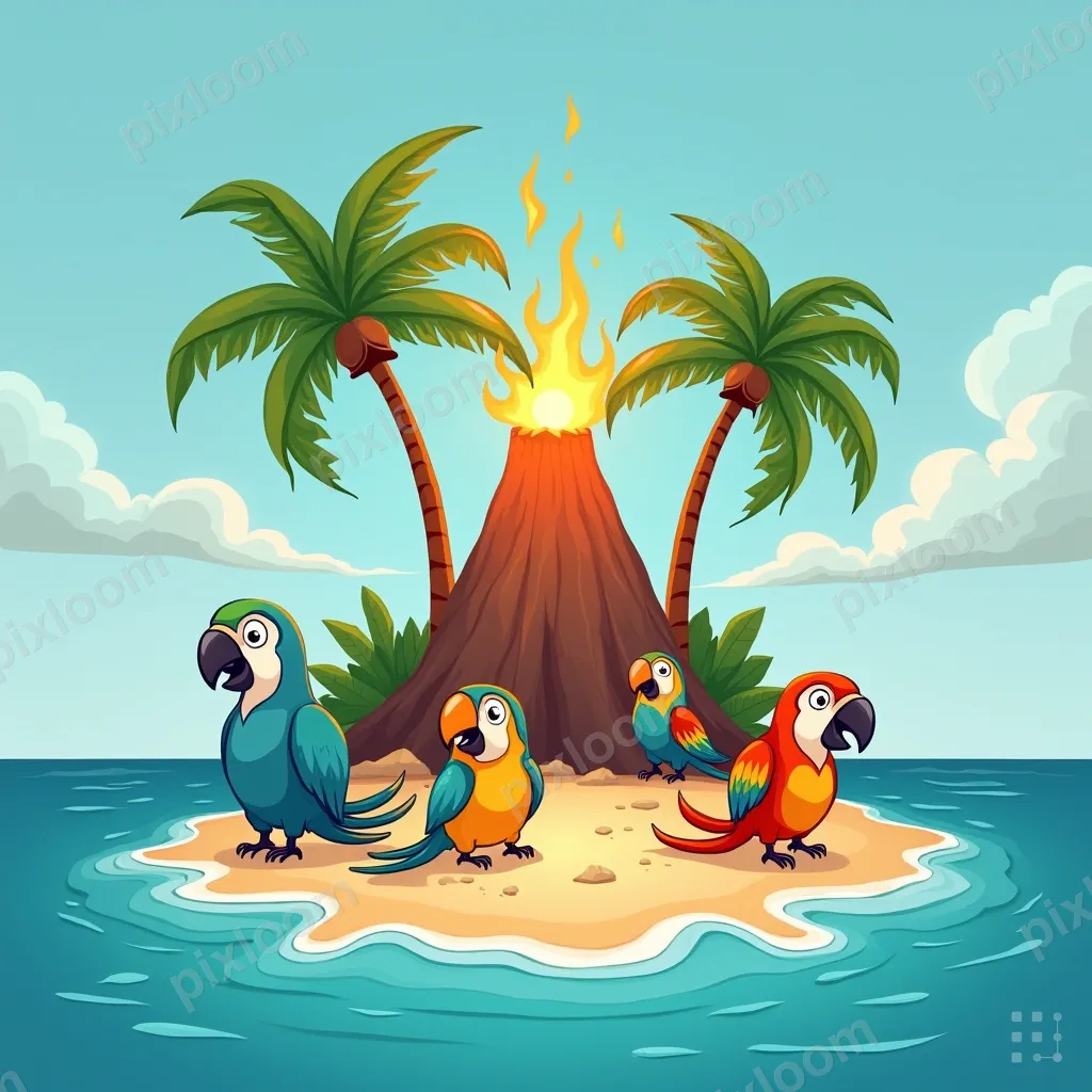 Cartoon1024x1024Cartoon tropical island with palm trees, a volcano, colorful parrots, blue ocean surrounding