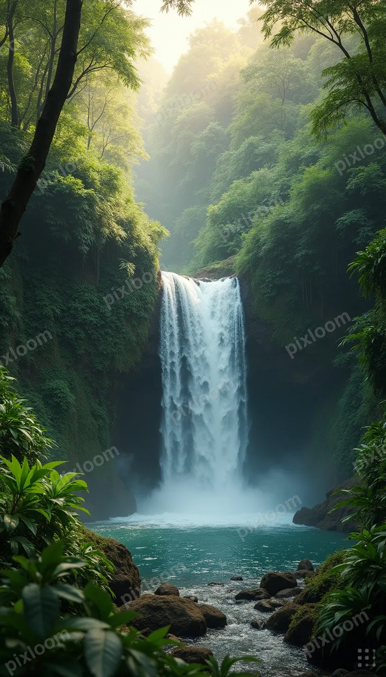 Photorealistic768x1344Cascading waterfall in lush tropical jungle, mist rising from pool below, emerald green ferns