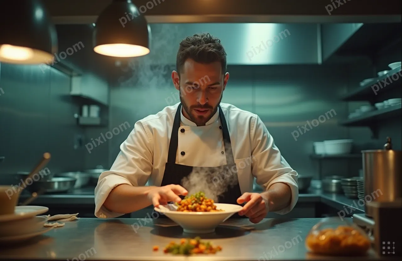 Cinematic1280x832Chef plating a dish in a restaurant kitchen, steam rising, precise movements, stainless steel surfaces