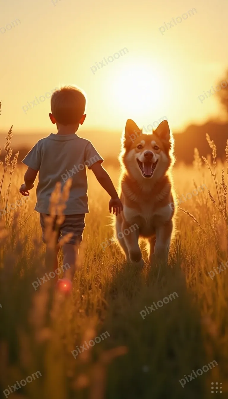 Cinematickids768x1344Child and dog running together through a field of tall grass, pure joy, backlit by sun