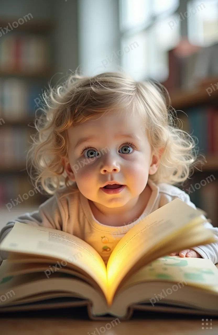 Bright & Airykids832x1280Child in a library, eyes wide at a pop-up book, wonder and surprise, colorful pages