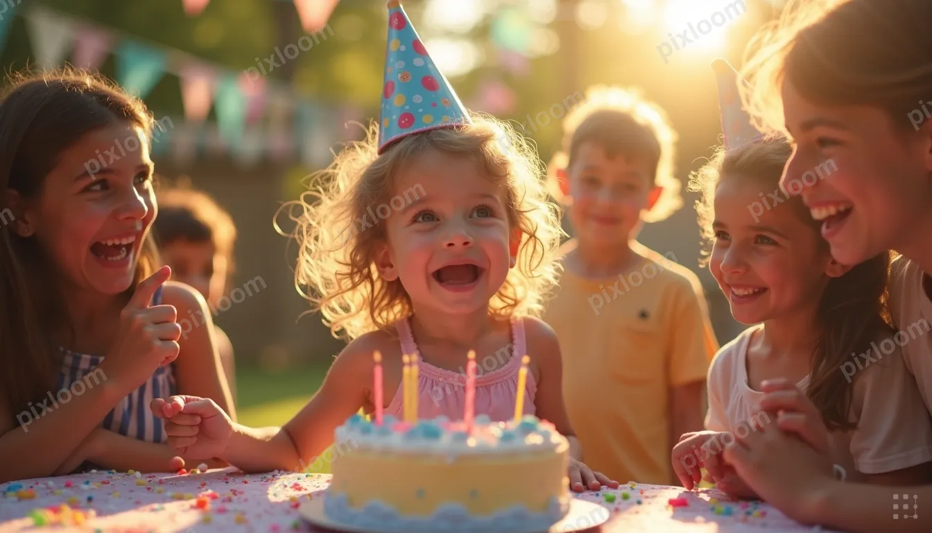Photorealistickids1344x768Child's birthday party in backyard, streamers, cake, friends gathered around, excited expressions