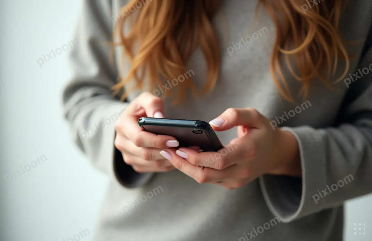 Product / Commercial1280x832Close-up of a person with long hair, holding a smartphone with both hands and typing. Foreground focuses on hands and device; background blurred. Indoor setting with soft side lighting.