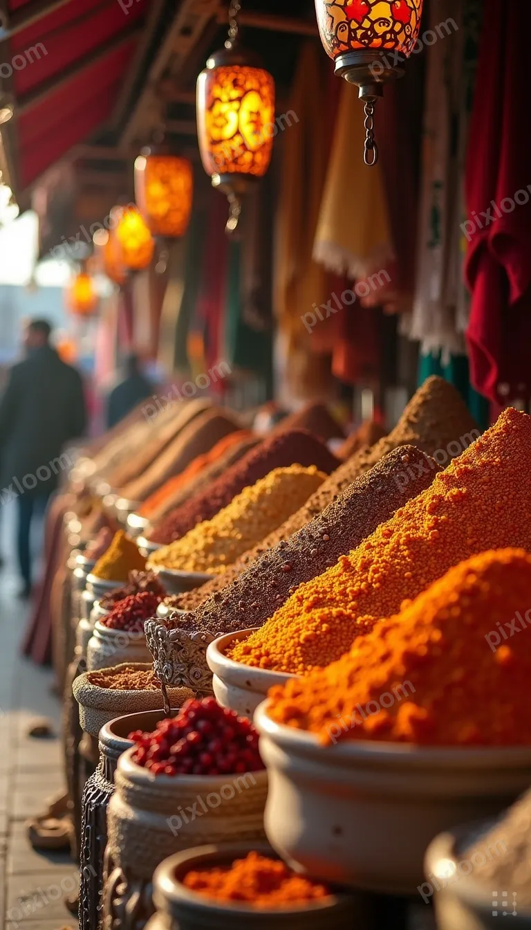 Photorealistic768x1344Colorful Moroccan market stall — spices in pyramids, textiles, lanterns, warm golden light