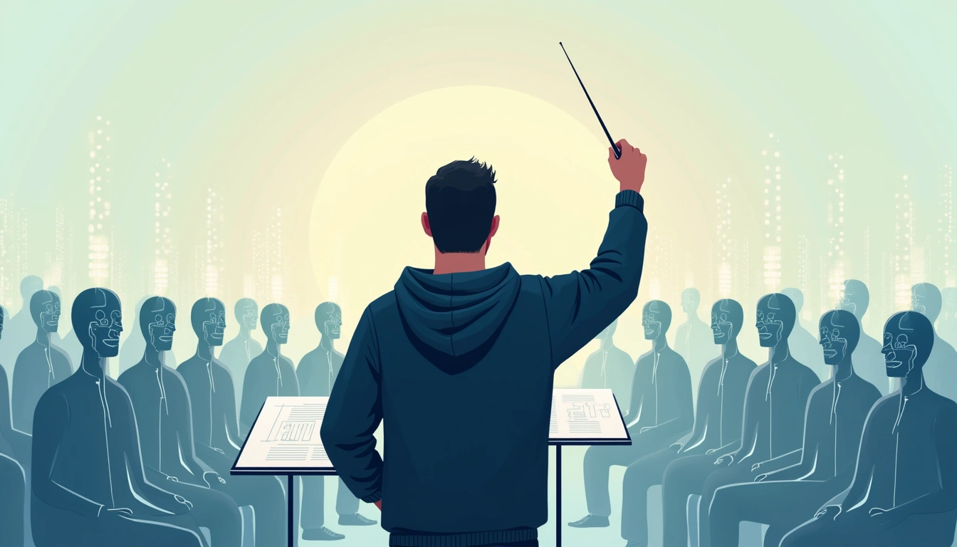 Minimalist1344x768Conductor seen from behind, shoulder-height camera slightly to the right. Back of the head and shoulders, right arm raised with baton. Wears a dark navy hoodie with white drawstrings. In the left third of a wide frame, the conductor. In front, filling the remaining two thirds, glowing geometric beings with circuit patterns, seated in curved rows. They emit streams of code and architecture diagrams. A music stand at the bottom edge holds a system architecture blueprint between the conductor and the orchestra. No text, no logos.